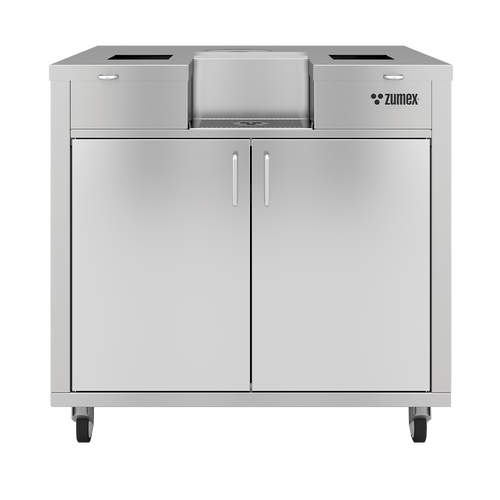 The Zumex Podium Wide Speed – Mirror is a commercial podium designed for use with Zumex Speed Up and Speed S Plus juicers. Its 80 cm width and dual waste trolleys provide extended capacity for peel collection, making it suitable for high-volume environments such as hotels, supermarkets, and juice bars.