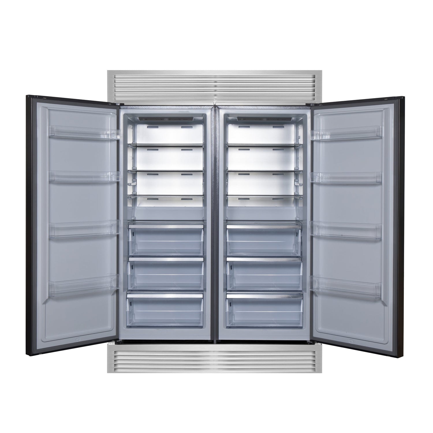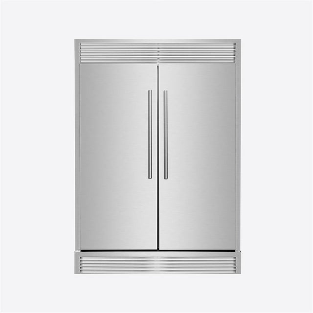 Two 28-inch refrigerator/freezer units are paired with a trim kit to create a unified 60-inch built-in installation.